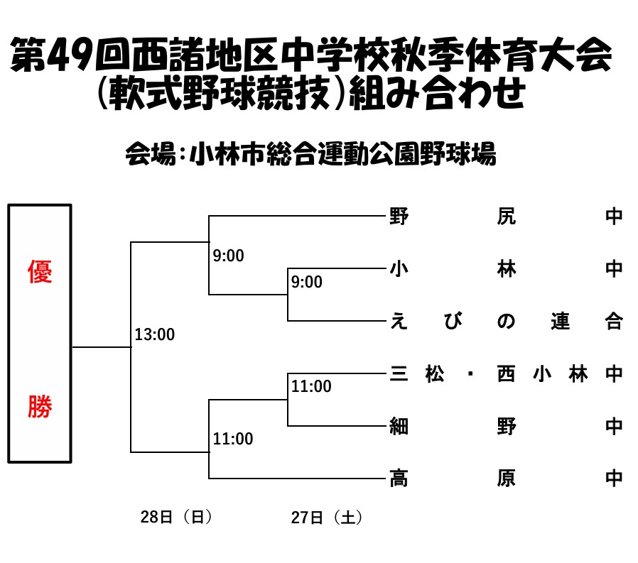 【中学】 「第49回西諸地区中学校秋季体育大会(軟式野球競技)」組み合わせ owner 3週間 ago 9月27.28日に西諸地区で開催される「第49回西諸地区中学校秋季体育大会(軟式野球競技)」の組み合わせです。 ご健闘をお祈りいたします。