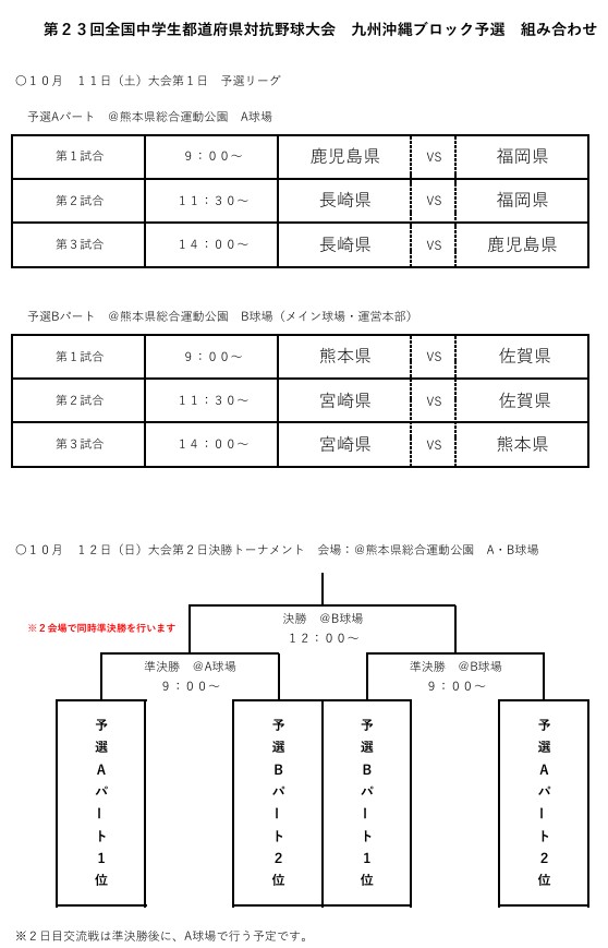 【中学】 「第23回全国都道府県対抗大会九州予選」組み合わせ owner 7日 ago 10月11.12日に熊本県で開催される「第23回全国都道府県対抗大会九州予選」の組み合わせです。 選抜チームのご健闘をお祈りいたします。