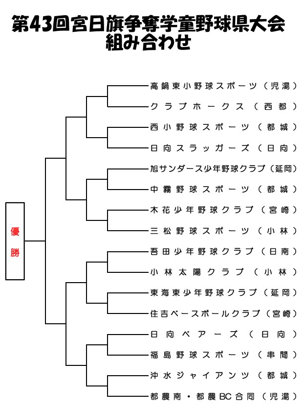 【学童】 「第43回宮日旗争奪学童野球県大会」組み合わせ owner 2日 ago 10月25日、11月2日に宮崎市で開催される「第43回宮日旗争奪学童野球県大会」の組み合わせです。 出場チームのご健闘をお祈りいたします。