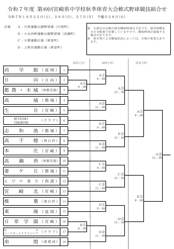 10月25日より児湯地区で開催される「第49回宮崎県中学校秋季体育大会(軟式野球競技)」の組み合わせです。
