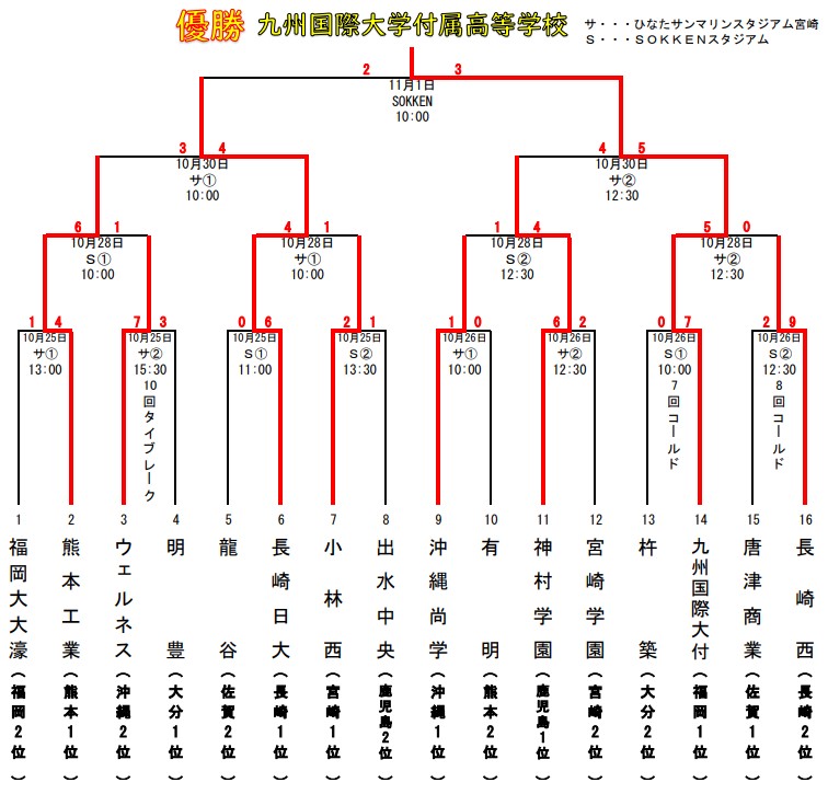 10月25日から宮崎県(ひなたサンマリンスタジアム宮崎・宮崎市清武SOKKENスタジアム)で開催された「第157回九州地区高等学校野球大会」の結果です。