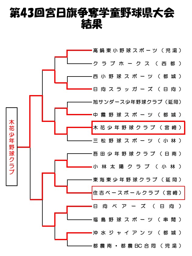 【学童】 「第43回宮日旗争奪学童野球県大会」結果 owner 13時間 ago 10月25日、11月2日に宮崎市で開催された「第43回宮日旗争奪学童野球県大会」の結果です。 優 勝:木花少年野球クラブ(宮崎) 準優勝:住吉ベースボールクラブ(宮崎) おめでとうございます。