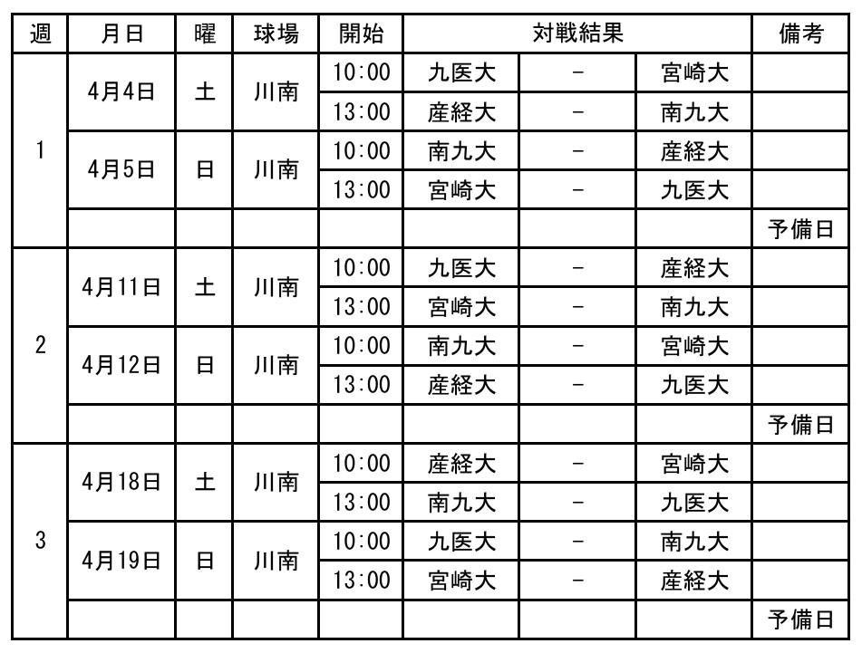 4月4日から川南町運動公園野球場で開催される「第3回南部九州大学野球選手権大会宮崎地区予選」の組み合わせです。